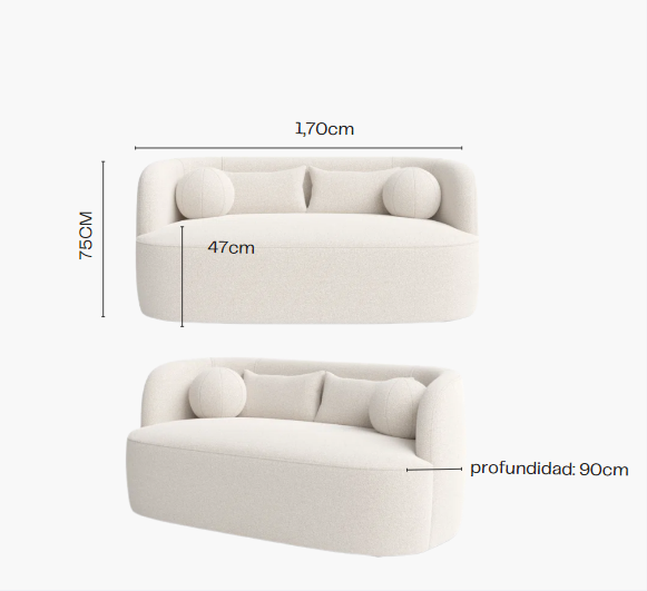 Con una altura total de 75 cm, una altura de asiento de 47 cm, una profundidad de 90 cm y un ancho de 1,70 cm, este sofá se adapta perfectamente a espacios contemporáneos sin sacrificar el confort.